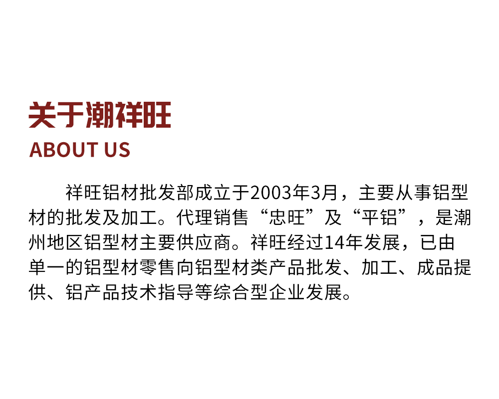 祥旺鋁材批發部成立于2003年3月,主要從事鋁型材的批發及加工。